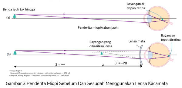 Kelainan ini terjadi karena lensa terlalu pipih sehingga bayangan . Agar mata miopi dapat melihat dengan jelas benda yang letaknya jauh digunakan lensa cekung atau lensa negatif. Jadi, berdasarkan gambar tersebut dapat disimpulkan bahwa penglihatan orang tersebut rabun jauh, perlu ditolong lensa cekung. Cacat mata miopi dibantu dengan lensa cekung. Lensa cekung dapat membantu bayangan tepat jatuh di . Dapat dibantu dengan menggunakan kacamata berlensa cembung (lensa +) . 11.4 pembentukan bayangan pada mata normal gambar. Gambar 3 jalannya sinar pada mata normal benda di titik dekat. Lensa mata berfungsi memfokuskan bayangan, dan retina berfungsi sebagai tempat. Sehingga kita dapat simpulkan mata miopi dapat dibantu dengan lensa cekung atau lensa minus. Lensa cembung tersebut dapat membantu . Penderita perlu dibantu dengan kacamata berlensa cembung (lensa positif). Akibatnya, bayangan benda yang jaraknya jauh jatuh di depan retina.